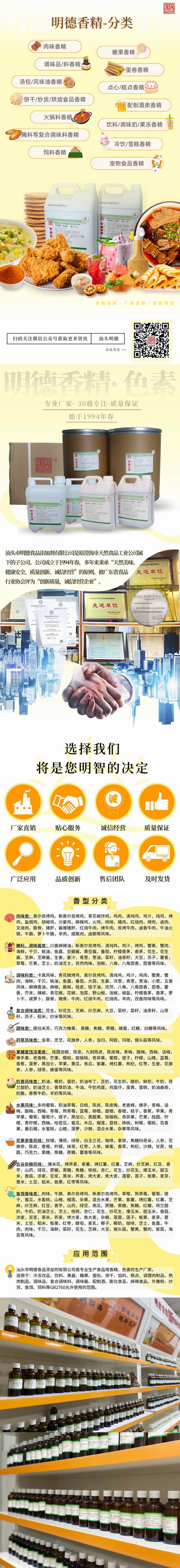 適用范圍:調(diào)味品、肉制品、調(diào)味料、火鍋調(diào)味料、烤肉醬、外撒粉、復(fù)合調(diào)味料、膨化食品、麻辣制品、罐頭、休閑小食品等GB2760允許添加食品用香精的食品。