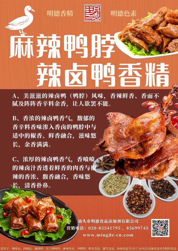 明德食品添加劑 還推出了麻辣鴨脖-辣鹵鴨香精,風(fēng)味香辣鮮香,伴著陣陣香辛料余香,同時(shí)椒辣香、鮮香、肉香融合,香味悠長(zhǎng)。